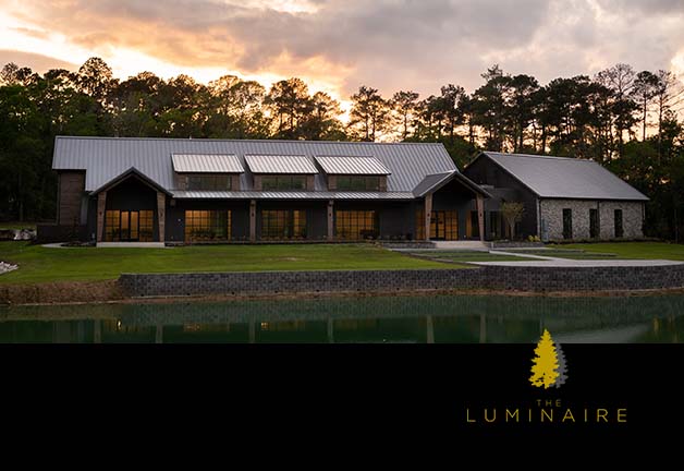The Luminaire has carefully curated areas for every aspect of your event. Expansive windows bring the outside in for ceremonies in our traditional indoor chapel. Our turfed lakeside ceremony area and large back porch offer an outdoor option for those nice Texas days. Inside, our cocktail area, full circle bar, and expansive reception hall allow plenty of space for dinner, drinks, and dancing. The property also features a private bridal suite and separate groom’s den.